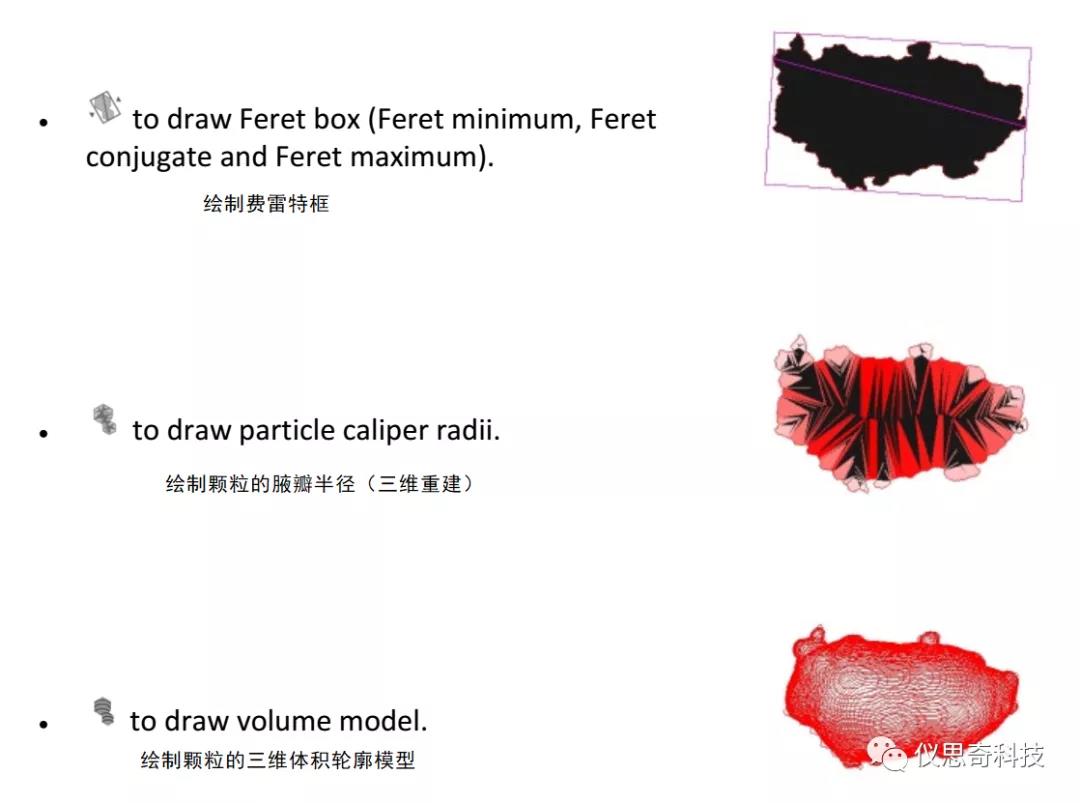 形状信息是对粒径分布的二维的补充,比如大小相识的颗粒可能在形状上大相径庭。对非球形颗粒准确 的定性,两维的形状信息是必需的。形状的差异可从粒形分布反映出来。动态图像分析抓取最佳的颗粒图像进行处理。得到的图像可经过复杂的图像分析程序分析,得到图像信息。